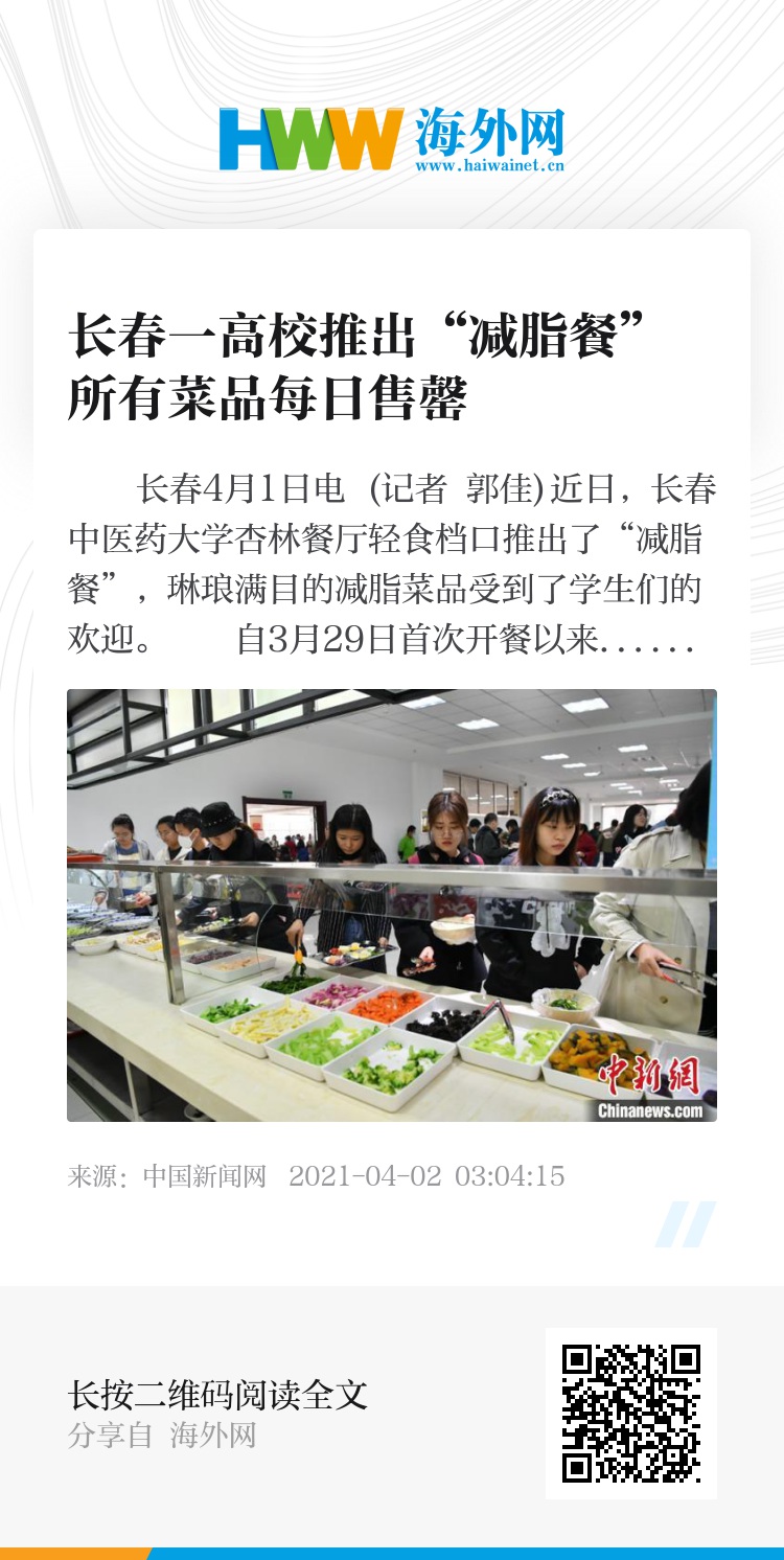 中新网长春4月1日电 (记者 郭佳)近日,长春中医药大学杏林餐厅轻食档口推出了“减脂餐”,琳琅满目的减脂菜品受到了学生们的欢迎。