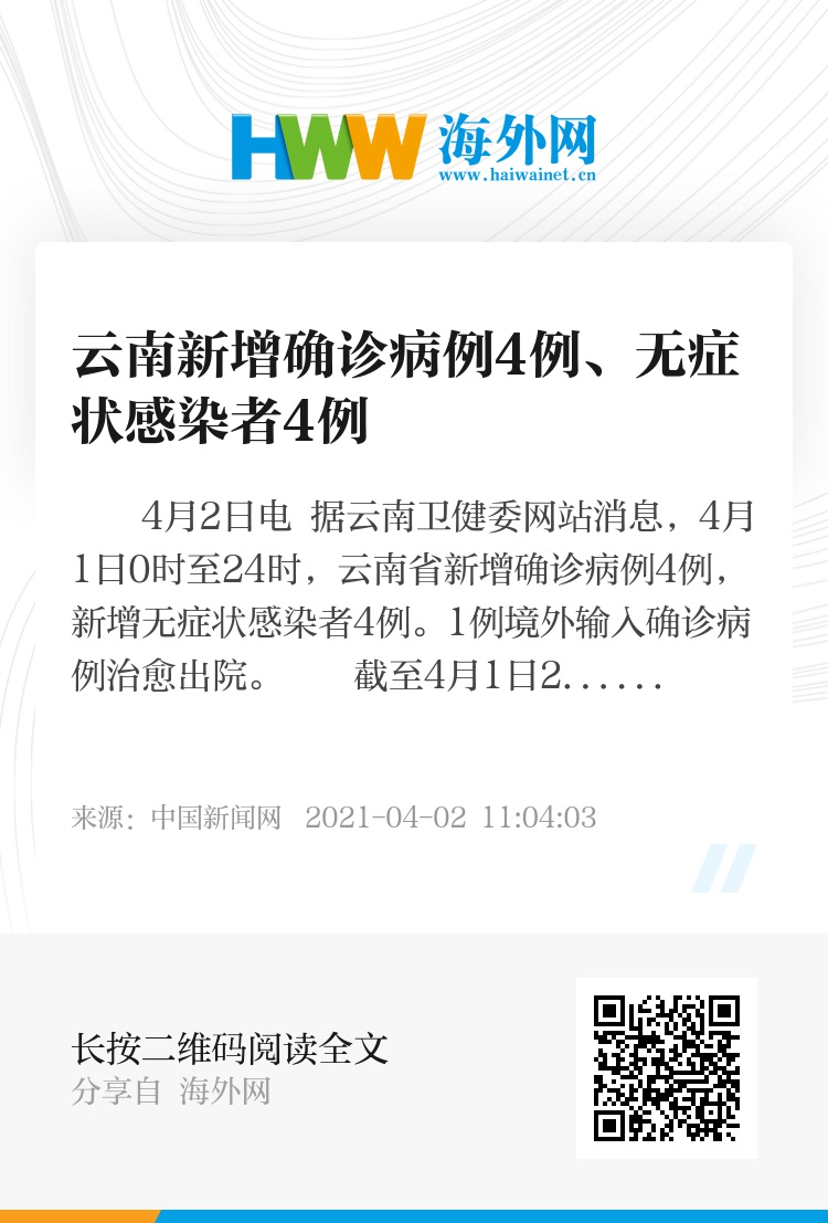 中新网4月2日电 据云南卫健委网站消息,4月1日0时至24时,云南省新增确诊病例4例,新增无症状感染者4例。1例境外输入确诊病例治愈出院。