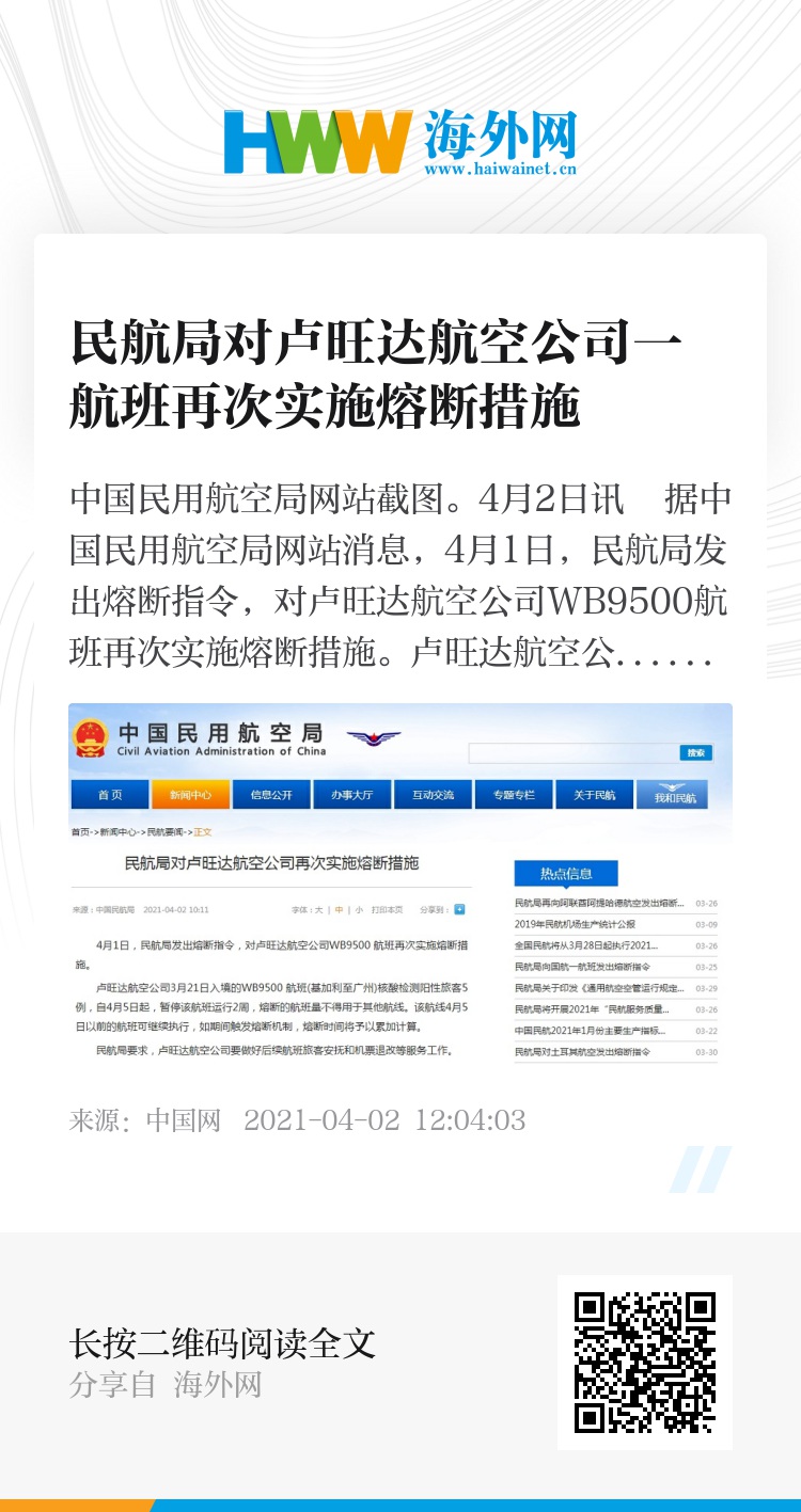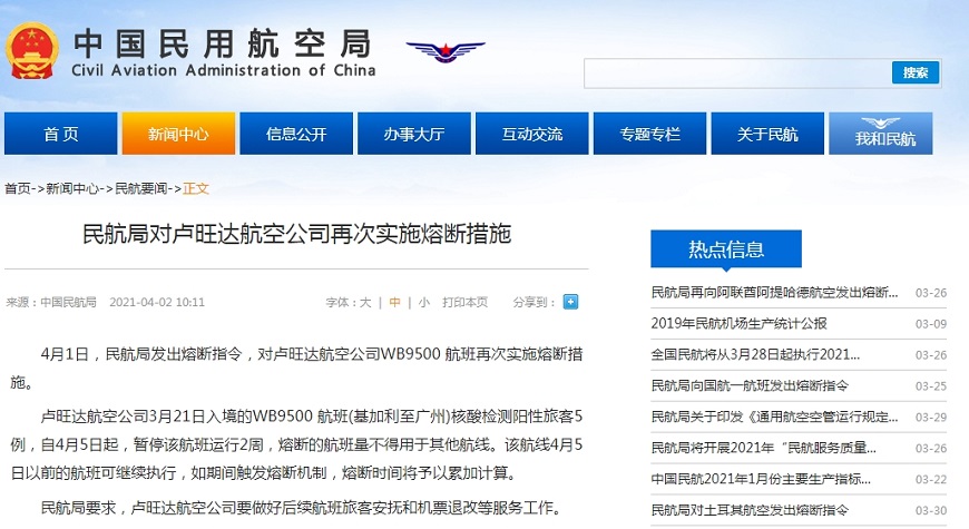 中国网4月2日讯 据中国民用航空局网站消息,4月1日,民航局发出熔断指令,对卢旺达航空公司WB9500航班再次实施熔断措施。