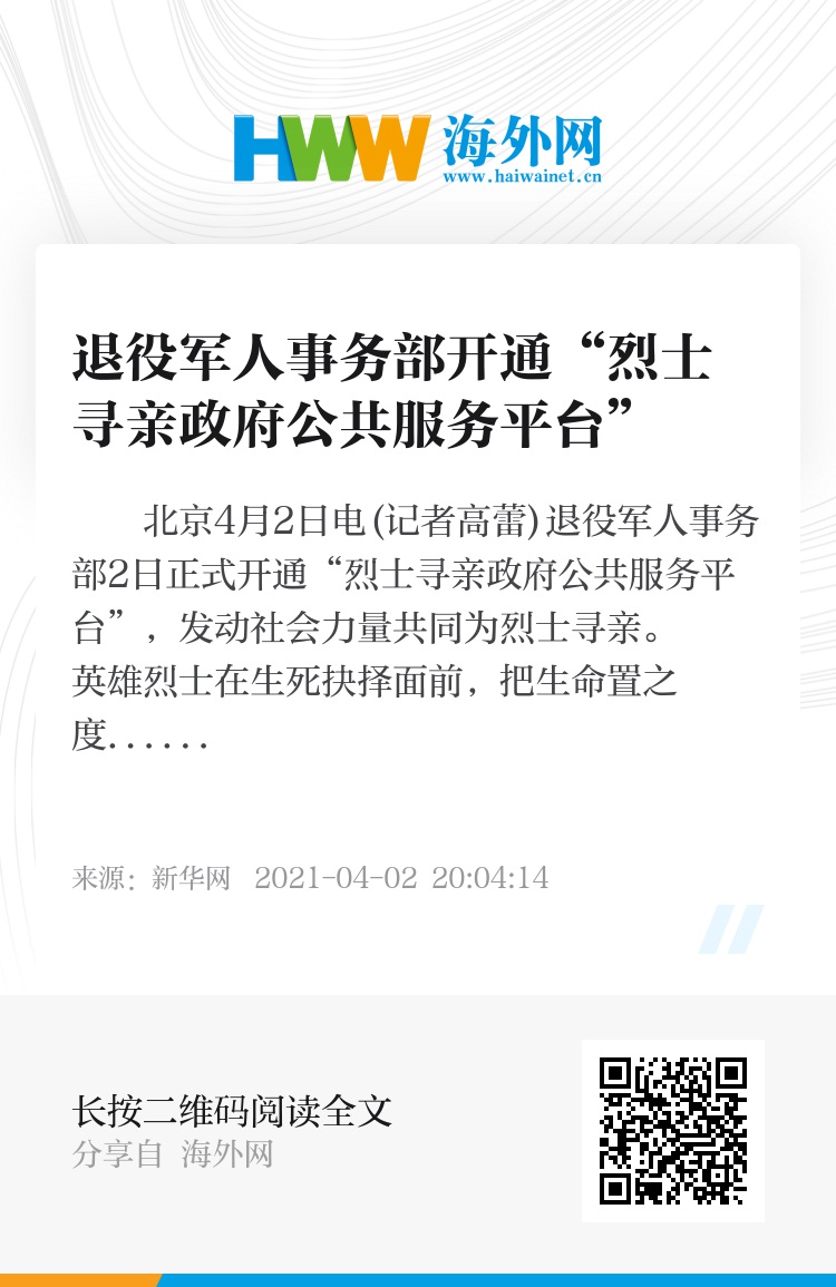新华社北京4月2日电(记者高蕾)退役军人事务部2日正式开通“烈士寻亲政府公共服务平台”,发动社会力量共同为烈士寻亲。