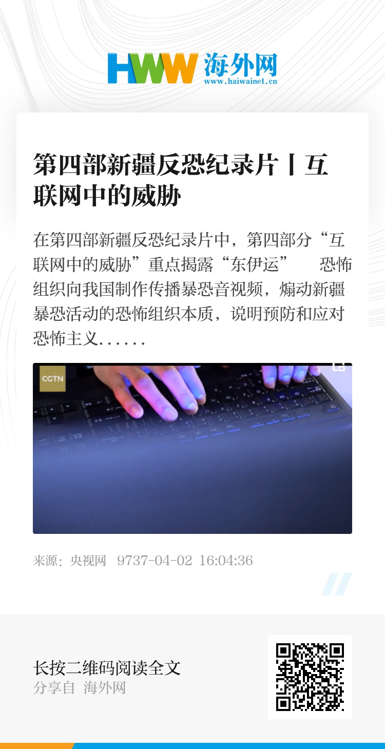 在第四部新疆反恐纪录片中,第四部分“互联网中的威胁”重点揭露“东伊运” 恐怖组织向我国制作传播暴恐音视频,煽动新疆暴恐活动的恐怖组织本质,说明预防和应对恐怖主义、极端主义传播仍是新疆面临的一项长期任务。
