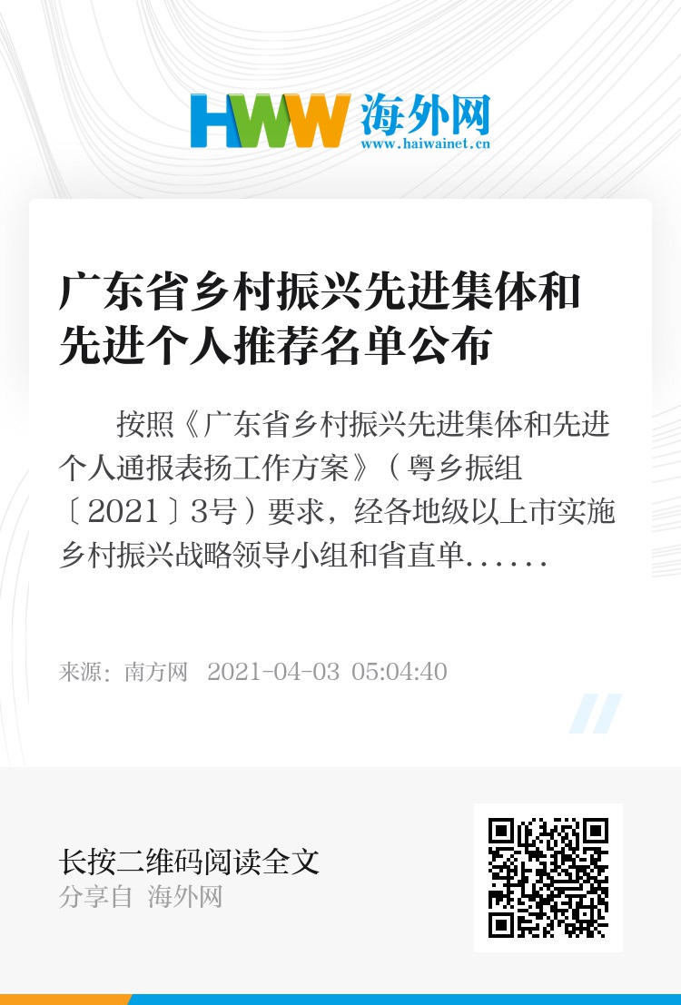 按照《广东省乡村振兴先进集体和先进个人通报表扬工作方案》(粤乡振组〔2021〕3号)要求,经各地级以上市实施乡村振兴战略领导小组和省直单位审核和推荐,省委实施乡村振兴战略领导小组办公室初步审核并征求省直有关单位部门意见,专家组评审等程序,现推荐广东省纪委监委党风政风监督室等110个集体为先进集体,庄悦群等304名同志为先进个人拟通报表扬对象。
