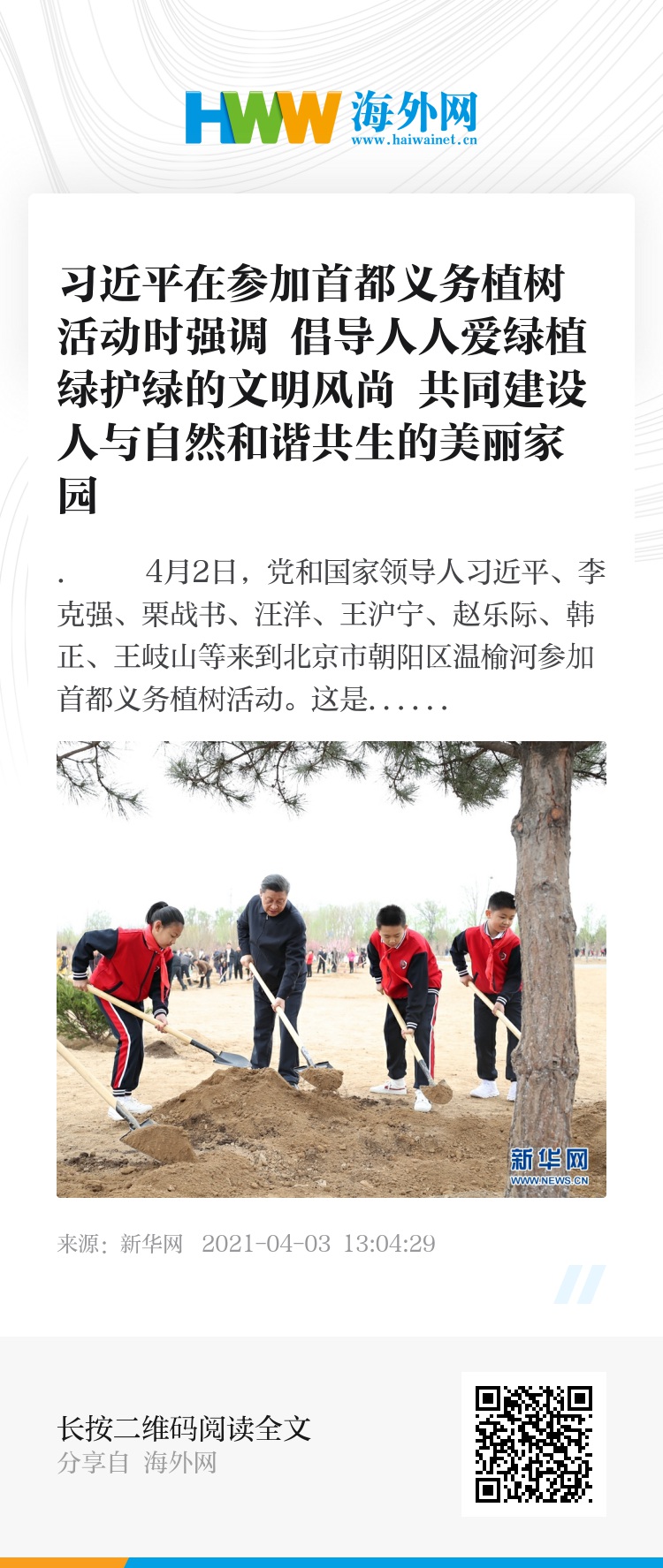 新华社北京4月2日电 中共中央总书记、国家主席、中央军委主席习近平2日上午在参加首都义务植树活动时强调,每年这个时候,我们一起参加义务植树,就是要倡导人人爱绿植绿护绿的文明风尚,让大家都树立起植树造林、绿化祖国的责任意识,形成全社会的自觉行动,共同建设人与自然和谐共生的美丽家园。