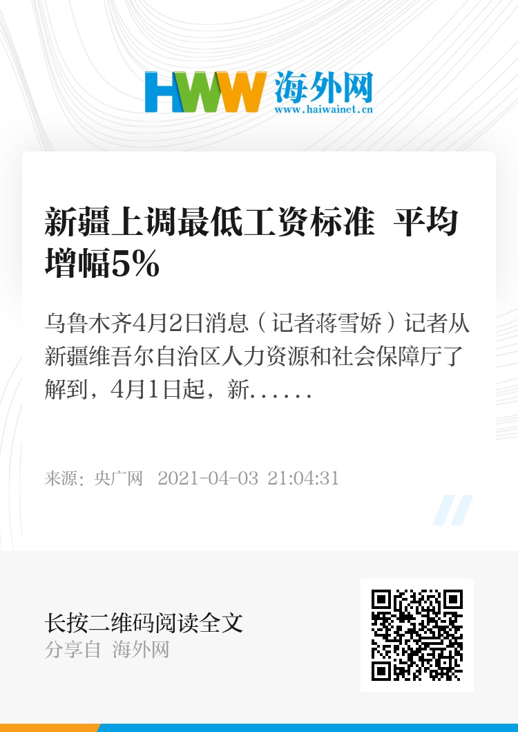 央广网乌鲁木齐4月2日消息(记者蒋雪娇)记者从新疆维吾尔自治区人力资源和社会保障厅了解到,4月1日起,新疆维吾尔自治区开始执行调整后的最低工资标准,平均增幅5%。