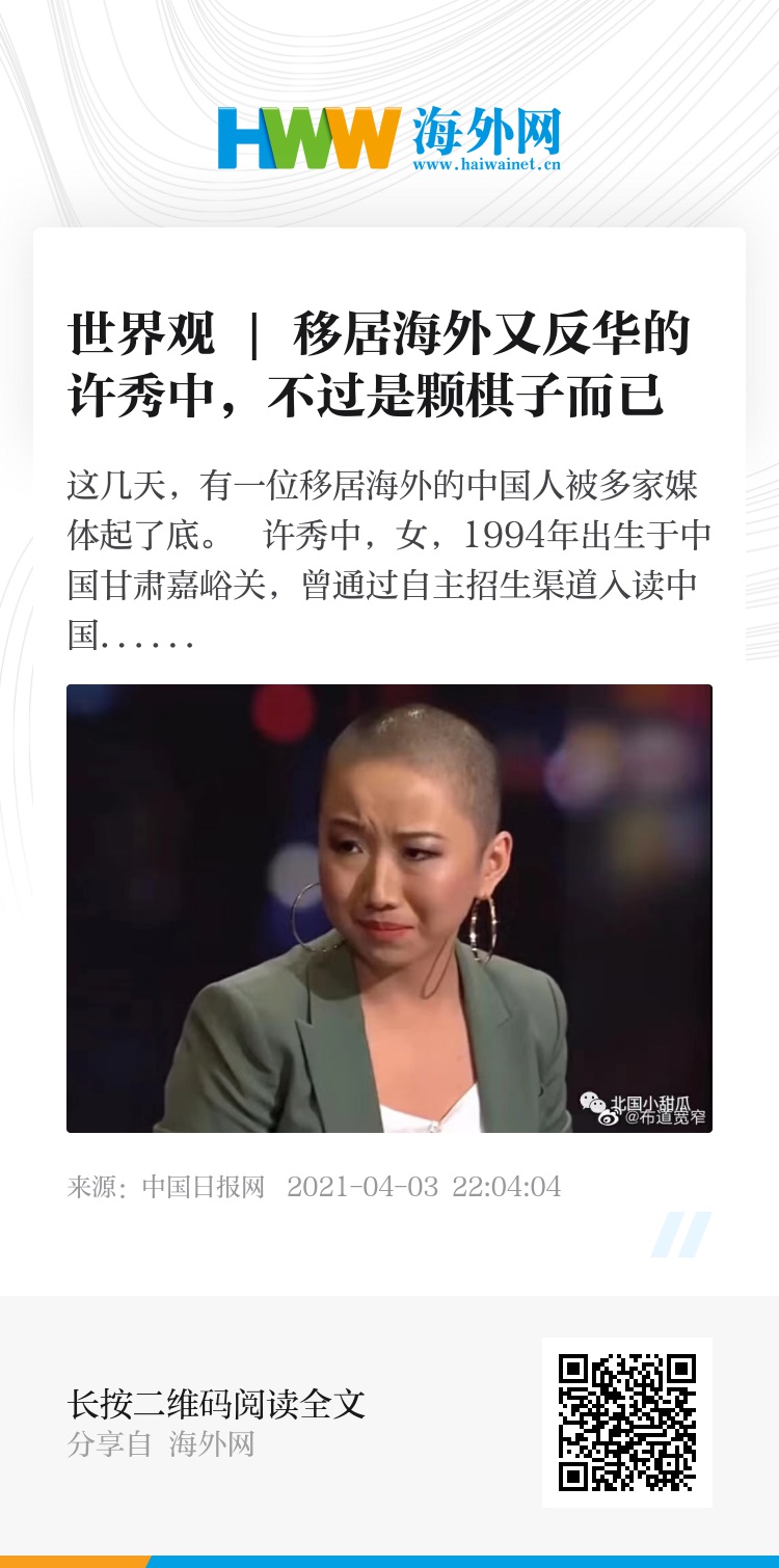 但仔细想想,她只是西方反华大棋局的一颗小棋子。许秀中作为棋子,只是提供了“莫须有”的炮弹,根子还是美西方政界和学界出于遏制中国企图的合谋。所谓新疆问题只是当前日益恶劣和畸形的对华政治生态所产生的恶果之一,没有新疆问题,他们也会捏造和炒作其他问题;没有许秀中,也会有李秀中、刘秀中。