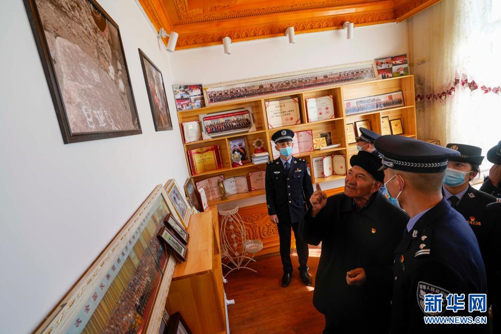 在“帕米尔雄鹰”拉齐尼·巴依卡的家中,拉齐尼·巴依卡父亲巴依卡·凯力迪别克(前右二)向卡拉苏出入境边防检查站民警介绍拉齐尼·巴依卡的护边故事(4月1日摄)。新华社记者 赵戈 摄