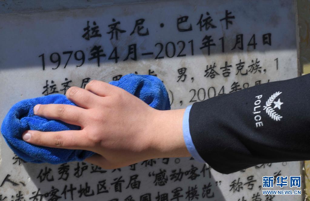 卡拉苏出入境边防检查站一位女民警擦拭“帕米尔雄鹰”拉齐尼·巴依卡的墓碑(4月1日摄)。新华社记者 赵戈 摄