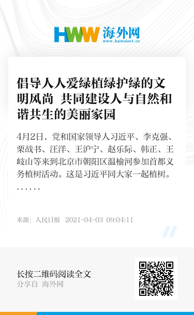 ■ 每年这个时候,我们一起参加义务植树,就是要倡导人人爱绿植绿护绿的文明风尚,让大家都树立起植树造林、绿化祖国的责任意识,形成全社会的自觉行动,共同建设人与自然和谐共生的美丽家园