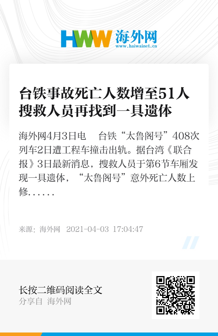 32043568,.台铁事故死亡人数增至51人 搜救人员再找到一具遗体,.2021-04-03 17:18:29,.204475,.王西洛、李萌