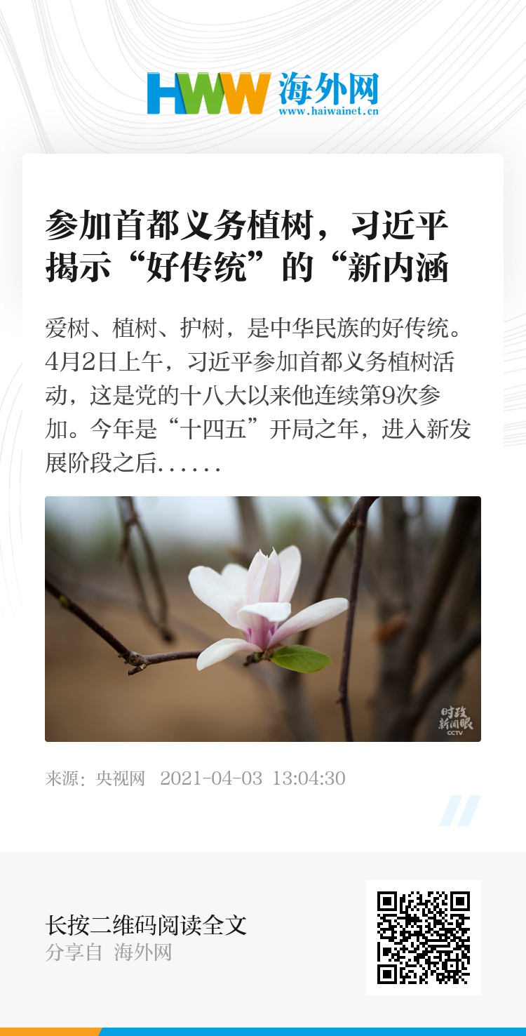 爱树、植树、护树,是中华民族的好传统。4月2日上午,习近平参加首都义务植树活动,这是党的十八大以来他连续第9次参加。今年是“十四五”开局之年,进入新发展阶段之后首次参加义务植树,总书记为“好传统”赋予了“新内涵”。