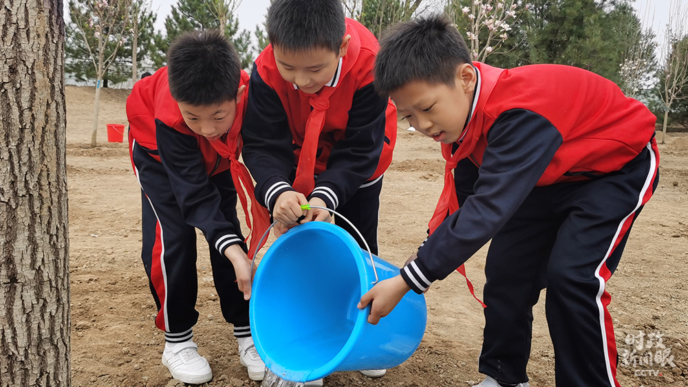 △少先队员拎桶浇水。(总台央视记者范凯拍摄)