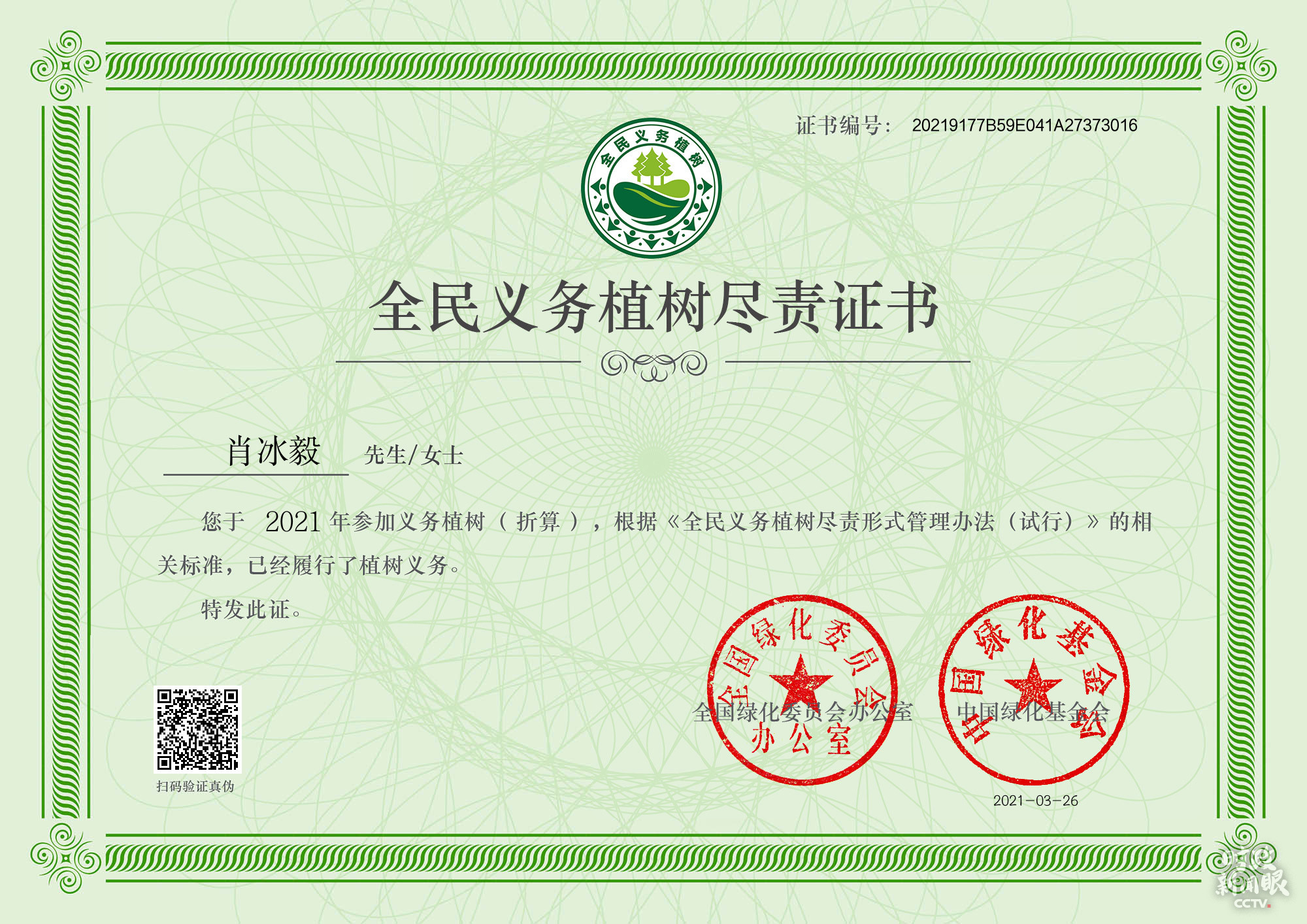 △通过网络捐款开展国土绿化、植树造林相关项目,完成植树义务后,可以获得《全民义务植树尽责证书》。(总台央视记者肖冰毅提供)
