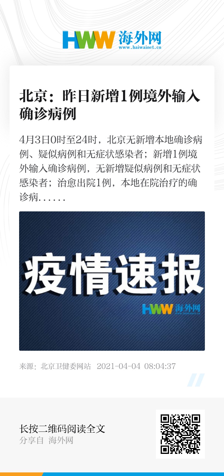 4月3日0时至24时,北京无新增本地确诊病例、疑似病例和无症状感染者;新增1例境外输入确诊病例,无新增疑似病例和无症状感染者;治愈出院1例,本地在院治疗的确诊病例全部清零。