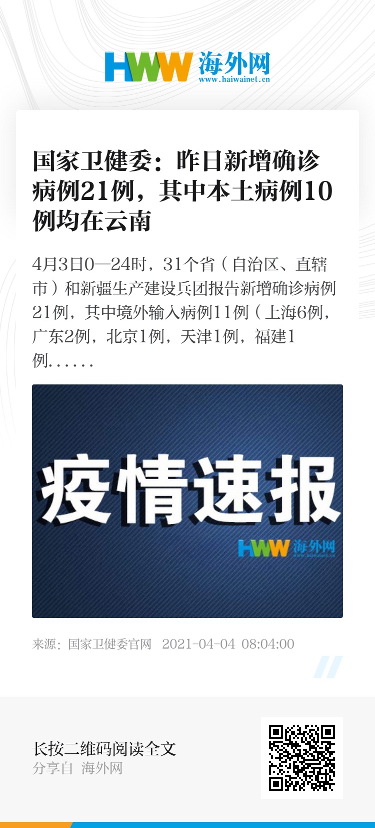 4月3日0—24时,31个省(自治区、直辖市)和新疆生产建设兵团报告新增确诊病例21例,其中境外输入病例11例(上海6例,广东2例,北京1例,天津1例,福建1例),本土病例10例(均在云南);无新增死亡病例;新增疑似病例2例,均为境外输入病例(均在上海)。