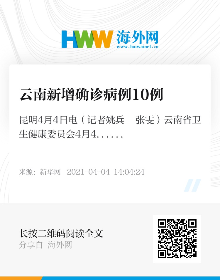 新华社昆明4月4日电(记者姚兵 张雯)云南省卫生健康委员会4月4日通报,4月3日0时至24时,云南省新增确诊病例10例(含3例无症状感染者转确诊病例),新增无症状感染者1例。