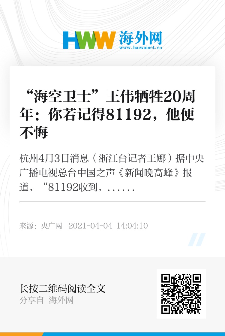 2001年4月1日,美国一架侦察机侵犯我国南海领空,我军随后派出两架飞机跟踪拦截。在执行飞行任务时,王伟所驾驶的歼-8Ⅱ战机遭美军飞机撞击,编号“81192”的飞行员王伟再也没有返航。王伟牺牲后,中央军委授予他“海空卫士”荣誉称号和一级英模奖章,“81192”这个数字更成了国家英雄的象征。王伟的父亲王明说,现在孙子也在海军服役,希望孙子继承他父亲的遗志,努力奋斗,报效祖国。