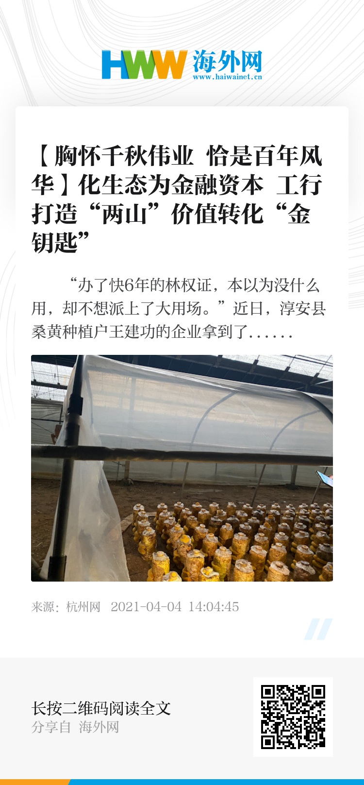 工行此次“存入绿水青山,取出金山银山”的成功转化,用改革创新融资方式,打造符合现代乡村产业体系、现代经营体系需求的金融支持模式,不仅是新路径的有益实践,也是致力于乡村振兴的最好注脚。