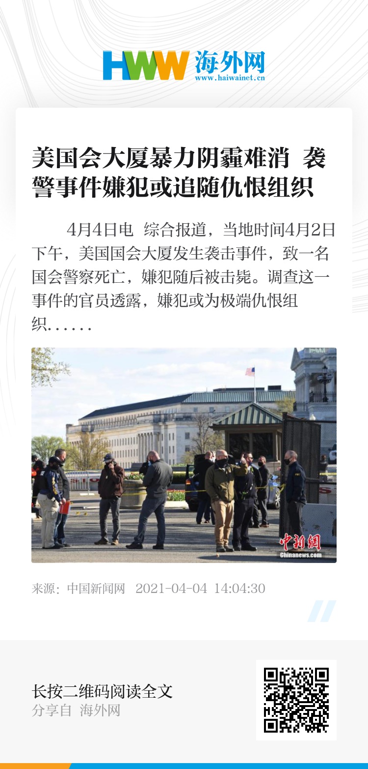 中新网4月4日电 综合报道,当地时间4月2日下午,美国国会大厦发生袭击事件,致一名国会警察死亡,嫌犯随后被击毙。调查这一事件的官员透露,嫌犯或为极端仇恨组织的追随者,曾多次在社交媒体发表仇恨言论。另一方面,美国国会大厦的安全问题引发议员们担忧。