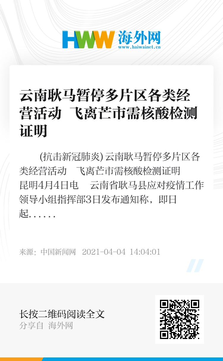 中新网昆明4月4日电 云南省耿马县应对疫情工作领导小组指挥部3日发布通知称,即日起暂停孟定城区、清水河片区及孟定农场相关场所经营活动。此外,芒市新冠肺炎疫情防控工作指挥部4月2日发布通告称,从4月3日23时30分起,乘飞机离开芒市需提供核酸检测证明。