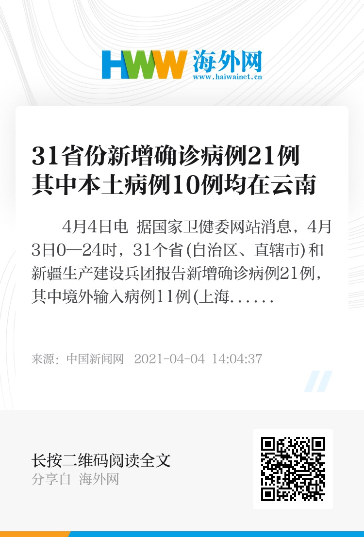 中新网4月4日电 据国家卫健委网站消息,4月3日0—24时,31个省(自治区、直辖市)和新疆生产建设兵团报告新增确诊病例21例,其中境外输入病例11例(上海6例,广东2例,北京1例,天津1例,福建1例),本土病例10例(均在云南);无新增死亡病例;新增疑似病例2例,均为境外输入病例(均在上海)。