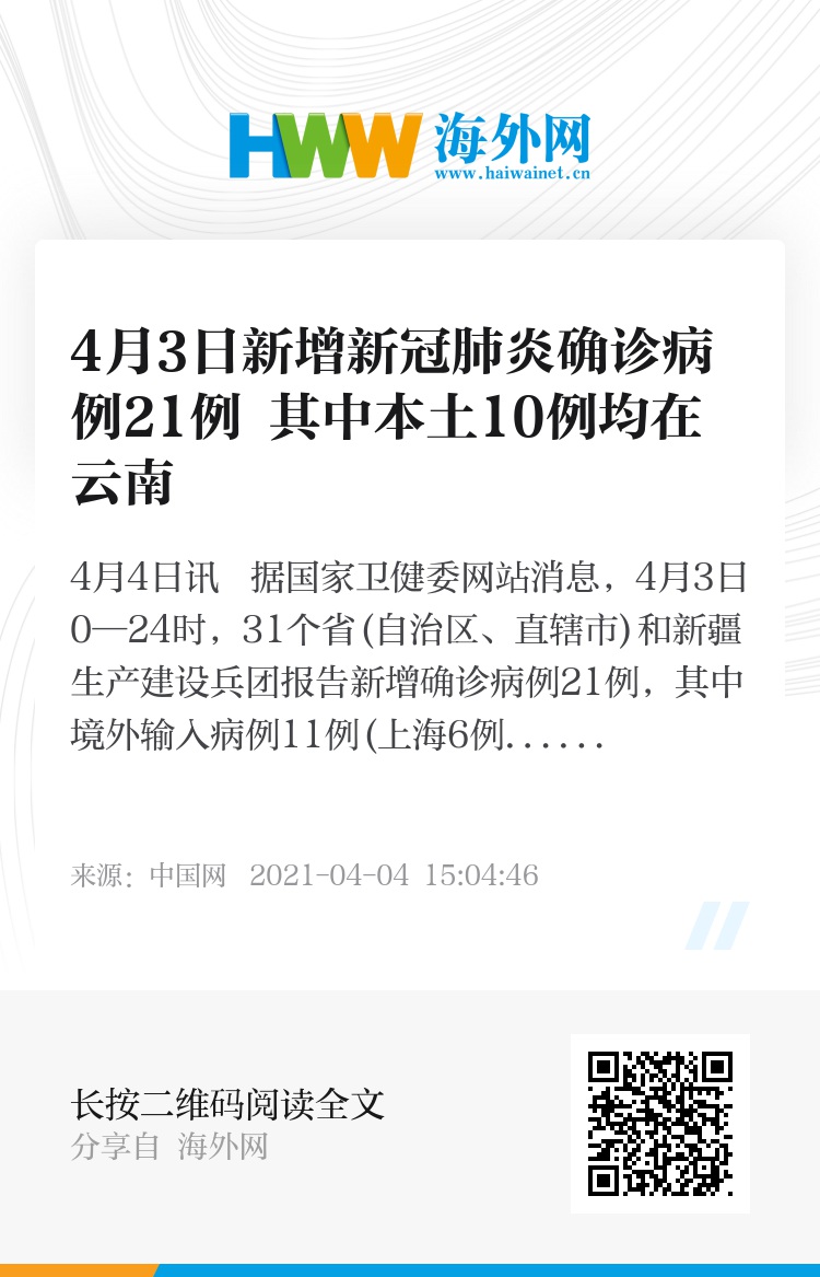 中国网4月4日讯 据国家卫健委网站消息,4月3日0—24时,31个省(自治区、直辖市)和新疆生产建设兵团报告新增确诊病例21例,其中境外输入病例11例(上海6例,广东2例,北京1例,天津1例,福建1例),本土病例10例(均在云南);无新增死亡病例;新增疑似病例2例,均为境外输入病例(均在上海)。