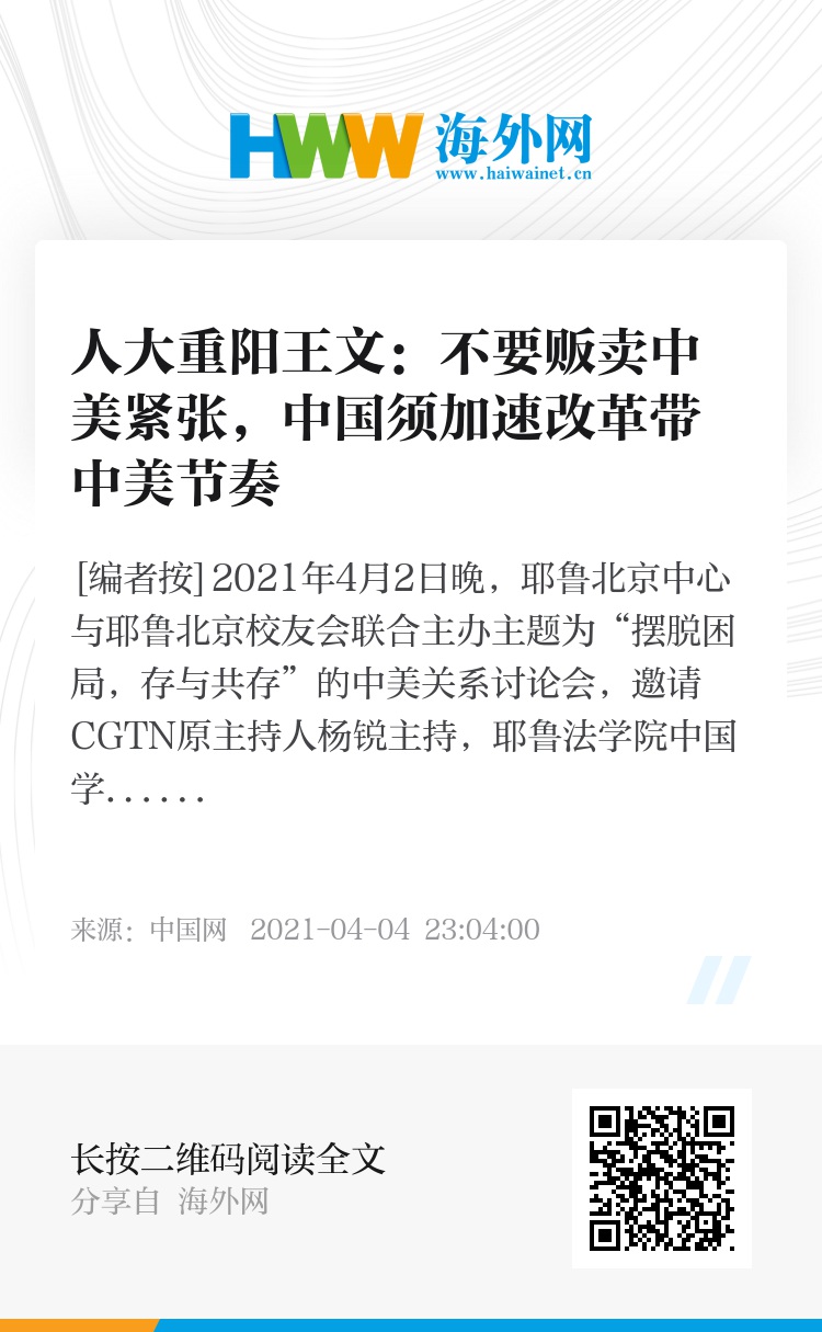 [编者按]2021年4月2日晚,耶鲁北京中心与耶鲁北京校友会联合主办主题为“摆脱困局,存与共存”的中美关系讨论会,邀请CGTN原主持人杨锐主持,耶鲁法学院中国学会主席高志凯、中国政策科学研究会经济政策委员会副主任徐洪才、中国人民大学重阳金融研究院(人大重阳)执行院长王文作主旨演讲,并和现场与线上10万多听众互动。以下为人大重阳执行院长、中美人文交流研究中心(教育部)执行主任王文现场讲演与互动的整理文稿。