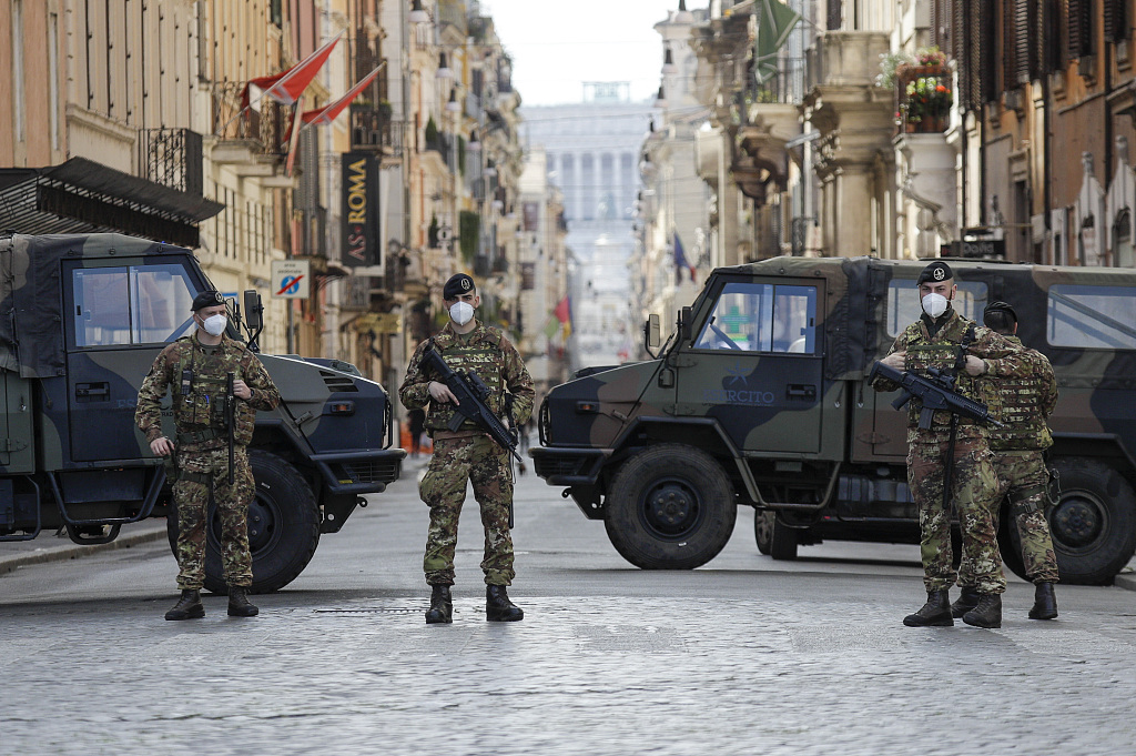 当地时间2021年4月3日,意大利罗马,由于复活节假期即将到来,意大利全境的疫情防控等级将于4月3日至6日升级为红色,警察和军人在街头巡逻。图片来源:人民视觉