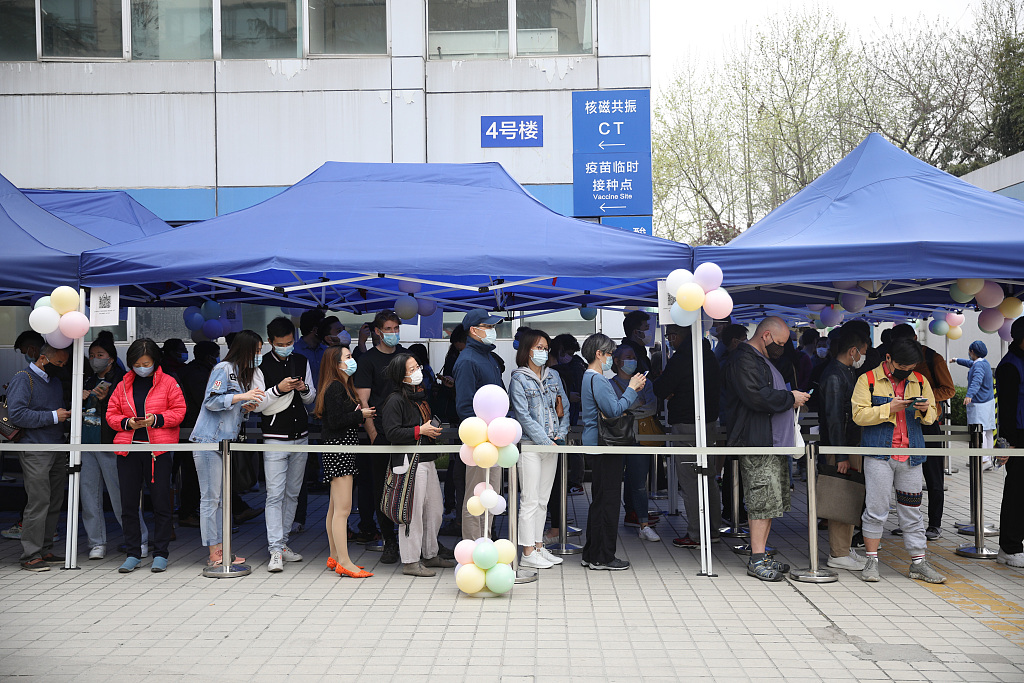 2021年4月3日下午,上海市同仁医院接种点开设在沪外籍人士新冠疫苗接种专场,来自美国、韩国、日本、马来西亚等国的720位外籍人士,通过“健康云”应用程序完成预约接种。上海市根据“知情、自愿、自费、风险自担”原则,已全面启动在沪外籍人士新冠疫苗预约接种。 图片来源:张亨伟/中新社