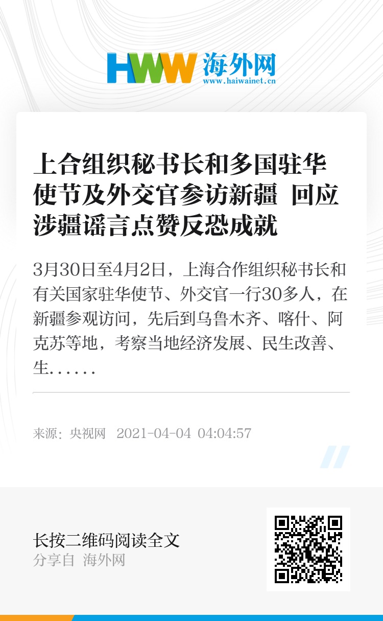 3月30日至4月2日,上海合作组织秘书长和有关国家驻华使节、外交官一行30多人,在新疆参观访问,先后到乌鲁木齐、喀什、阿克苏等地,考察当地经济发展、民生改善、生态建设、宗教信仰自由等方面情况。在新疆参观访问期间,使节团首站参观了新疆反恐和去极端化斗争主题展,多国大使对中国政府为打击恐怖主义和极端主义所作的努力,给予高度肯定。