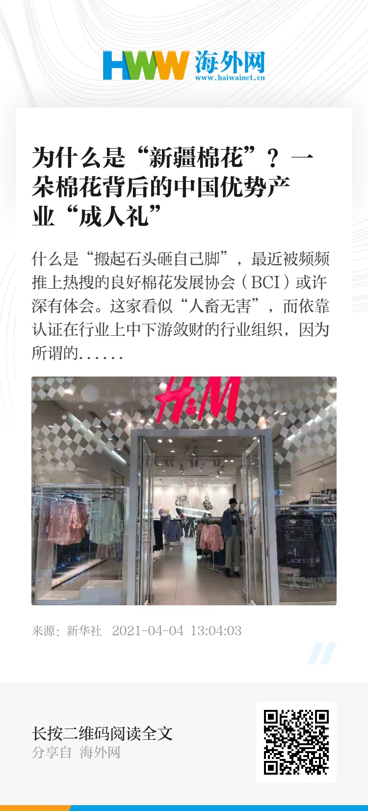 姚为群认为,商业集团最担心成为政治和人权攻击的靶子,此次“新疆棉花”事件中涉及的外资企业,可能将其生产和销售环节移出,转移到马来西亚、越南、墨西哥等经济体。然而,中国市场始终是潜力巨大、发展动力十足的优势市场,相信外资企业会做出理性的选择。