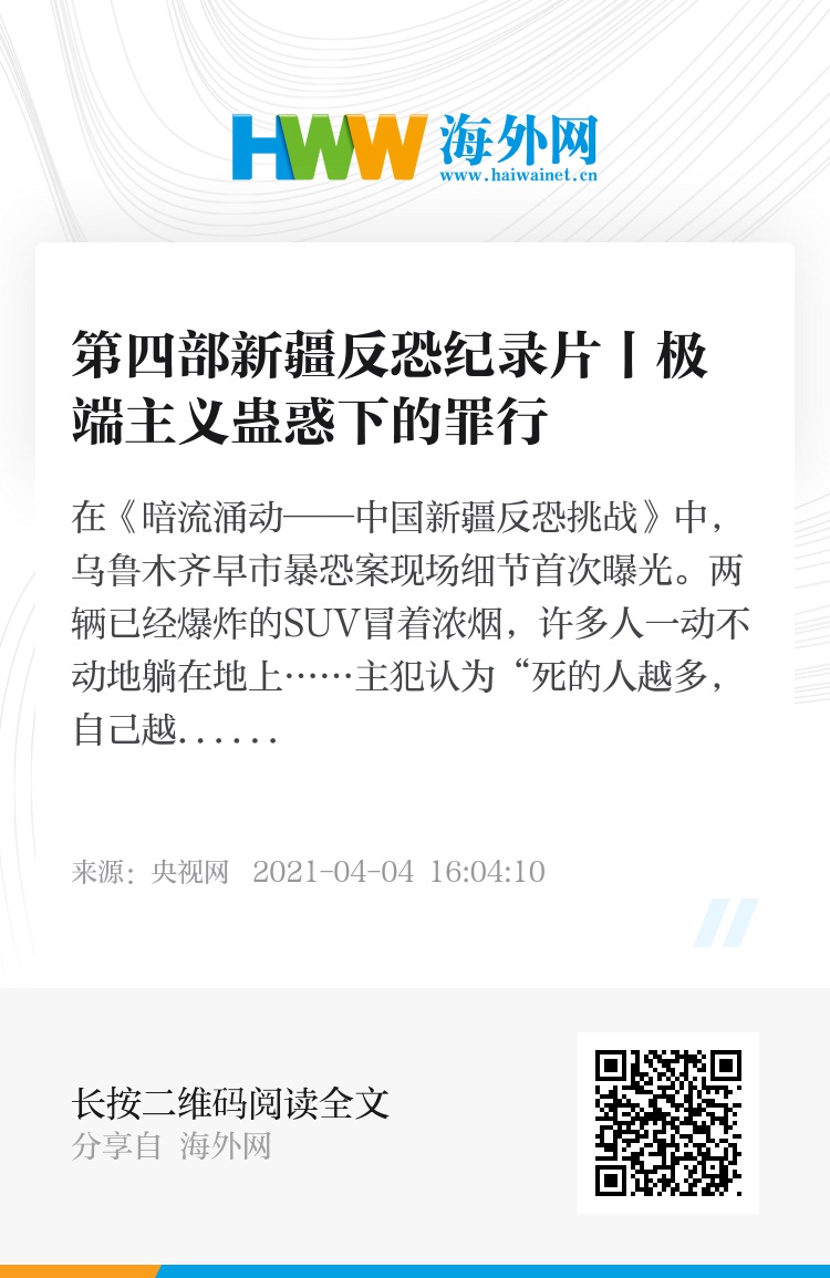 在《暗流涌动——中国新疆反恐挑战》中,乌鲁木齐早市暴恐案现场细节首次曝光。两辆已经爆炸的SUV冒着浓烟,许多人一动不动地躺在地上……主犯认为“死的人越多,自己越可能进天堂”。