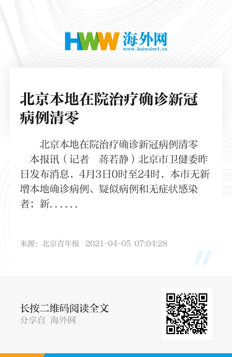 本报讯(记者 蒋若静)北京市卫健委昨日发布消息,4月3日0时至24时,本市无新增本地确诊病例、疑似病例和无症状感染者;新增1例境外输入确诊病例,无新增疑似病例和无症状感染者;治愈出院1例,本地在院治疗的确诊病例全部清零。