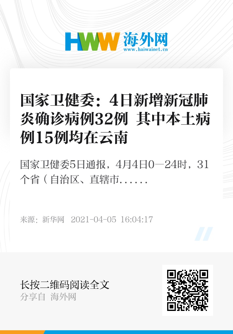 国家卫健委5日通报,4月4日0―24时,31个省(自治区、直辖市)和新疆生产建设兵团报告新增确诊病例32例,其中境外输入病例17例(陕西4例,上海3例,四川3例,江苏2例,北京1例,天津1例,内蒙古1例,浙江1例,福建1例),本土病例15例(均在云南);无新增死亡病例;无新增疑似病例。