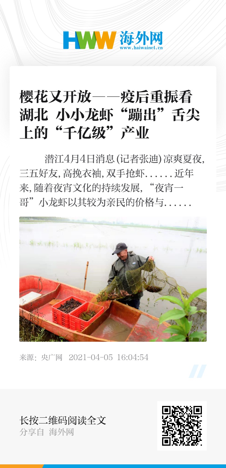 据了解,目前潜江虾稻共作面积达85万亩,2020年虾―稻产业产业链综合产值已达520亿元,极大促进了农业供给侧结构性改革,拓展了农民增收空间。下一步,潜江将持续推进龙虾产业标准化、规模化、市场化、品牌化发展,打造千亿元产值的虾―稻特色产业集聚区。
