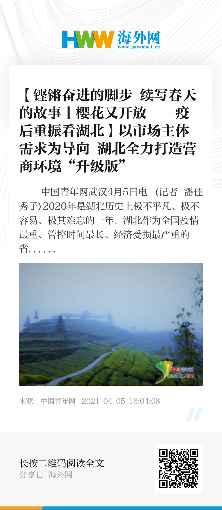 中国青年网武汉4月5日电 (记者 潘佳秀子)2020年是湖北历史上极不平凡、极不容易、极其难忘的一年。湖北作为全国疫情最重、管控时间最长、经济受损最严重的省份,在危机中育新机,于变局中开新局。面对疫情对经济社会发展的严重冲击,湖北全省上下保持“大战”状态、“大考”作风,苦练“自己走”的内功,把优化营商环境作为疫后重振,加速经济回温的重要举措。