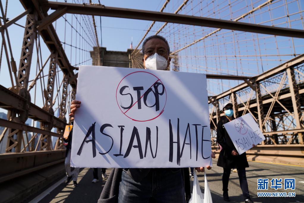 4月4日,在美国纽约布鲁克林大桥,人们参加游行反对亚裔仇恨。当天,大量示威者在美国纽约举行主题为“停止仇恨犯罪、反对种族歧视、捍卫亚裔权益”的大型集会游行活动。新华社记者 王迎 摄