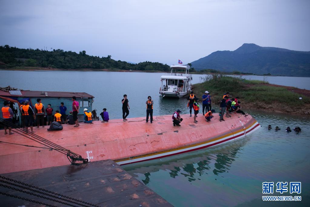 4月4日,在老挝首都万象附近的南俄湖旅游区,搜救人员在游艇倾覆事故现场搜救。当日,南俄湖旅游区发生游艇倾覆事故,造成8人死亡。新华社发(凯乔摄)