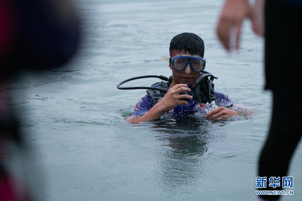 4月4日,在老挝首都万象附近的南俄湖旅游区,一名搜救人员下水搜救。当日,南俄湖旅游区发生游艇倾覆事故,造成8人死亡。新华社发(凯乔摄)
