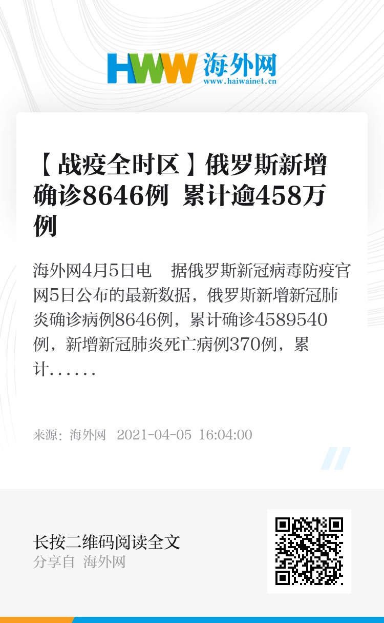 32044800,.【战疫全时区】俄罗斯新增确诊8646例 累计逾458万例,.2021-04-05 16:01:00,.204477,.吴倩、刘强