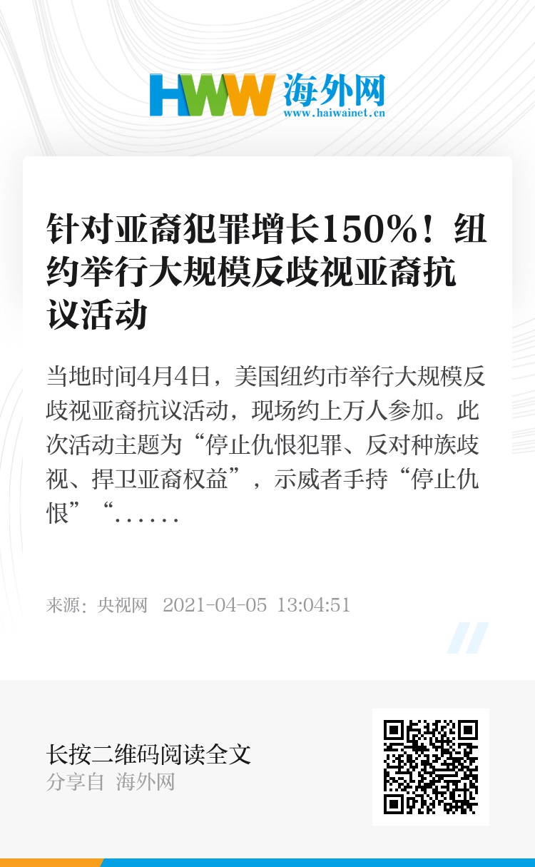 当地时间4月4日,美国纽约市举行大规模反歧视亚裔抗议活动,现场约上万人参加。