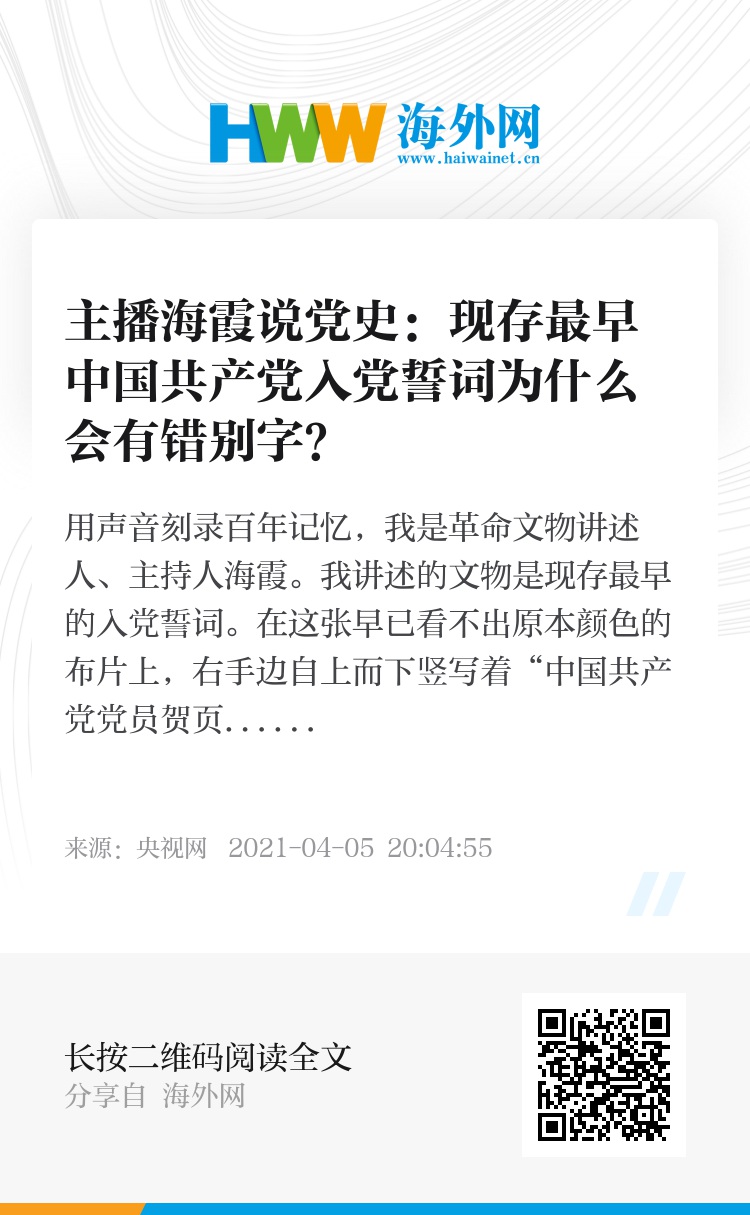 用声音刻录百年记忆,我是革命文物讲述人、主持人海霞。我讲述的文物是现存最早的入党誓词。在这张早已看不出原本颜色的布片上,右手边自上而下竖写着“中国共产党党员贺页朵,地点北田村”等15个字,正中从右到左写着“ 牺牲个人,言(严)首(守)纟必(秘)蜜(密), 阶级斗争,努力革命,伏(服)从党其(纪),永不叛党”;正中最上方是“C.C.P.”3 个英文字母,也就是中国共产党的英文缩写;最左边是竖体的一九三一年一月二十五号。