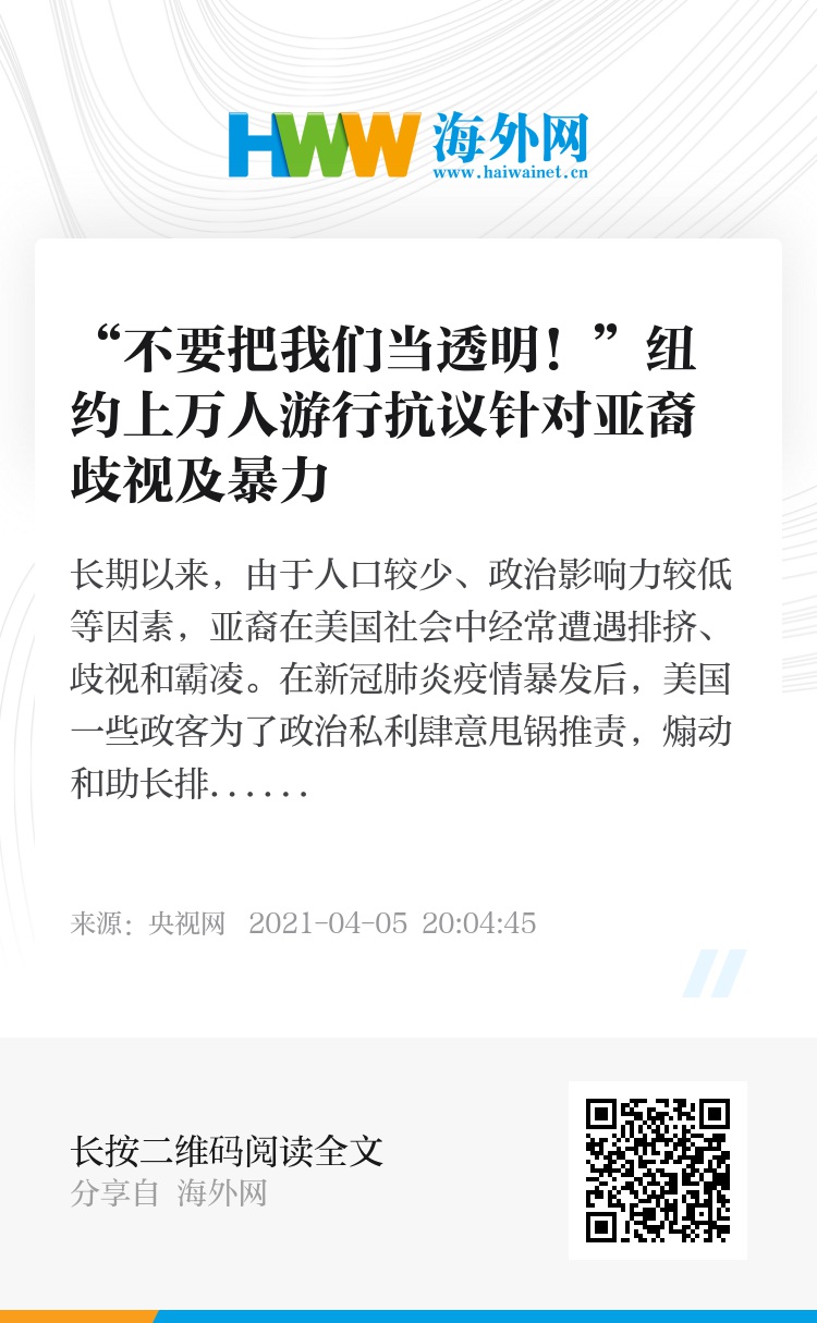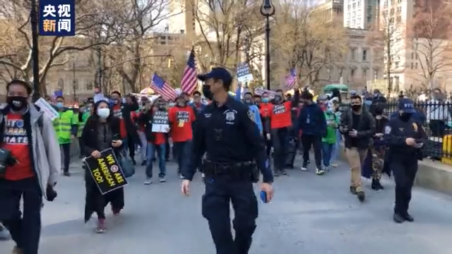 当地时间4月4日,美国纽约市上万群众走上街头,抗议近期不断在纽约市和全美发生的针对亚裔的种族歧视及暴力事件。