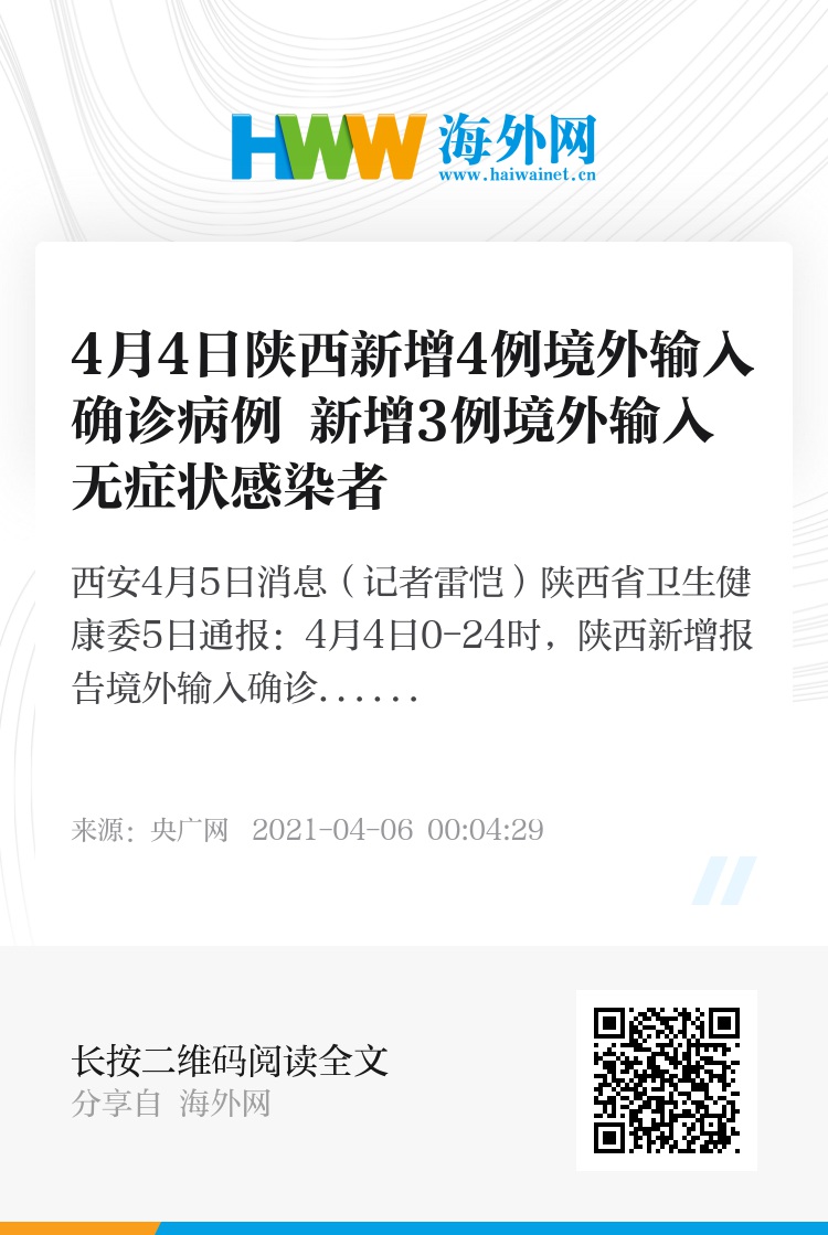 央广网西安4月5日消息(记者雷恺)陕西省卫生健康委5日通报:4月4日0-24时,陕西新增报告境外输入确诊病例4例、无症状感染者3例。