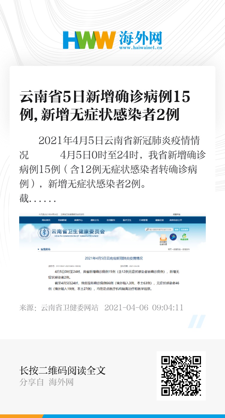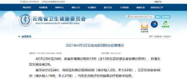 4月5日0时至24时,我省新增确诊病例15例(含12例无症状感染者转确诊病例),新增无症状感染者2例。