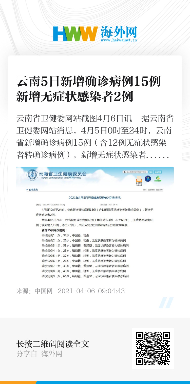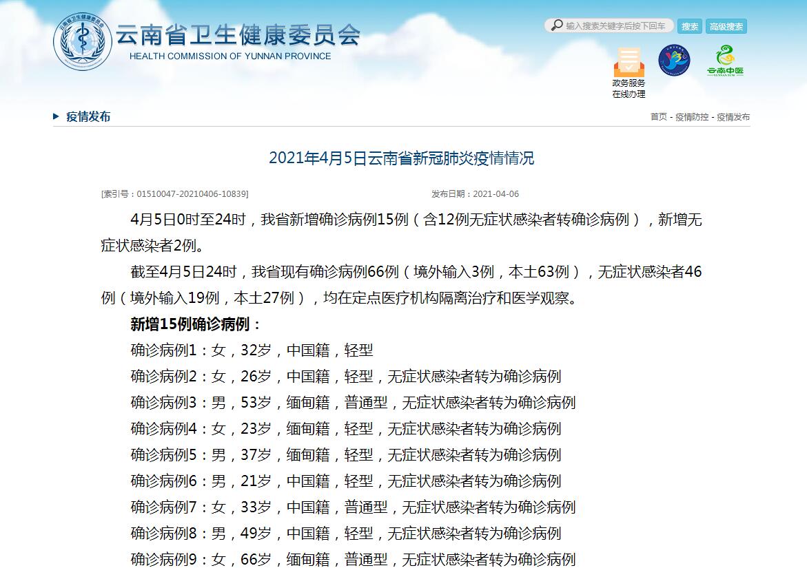 中国网4月6日讯 据云南省卫健委网站消息,4月5日0时至24时,云南省新增确诊病例15例(含12例无症状感染者转确诊病例),新增无症状感染者2例。