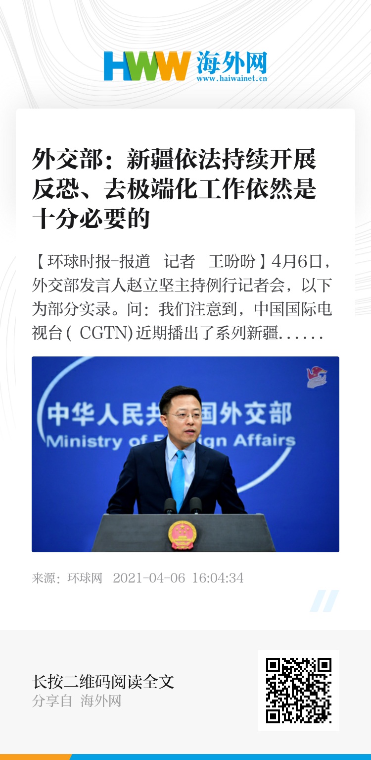 问:我们注意到,中国国际电视台( CGTN)近期播出了系列新疆反恐纪录片的第四部,引起了舆论广泛关注。此前,中方多次强调新疆已经四年多没有发生暴恐案事件,那么现在是否仍然认为涉疆问题是反恐、去极端化问题?