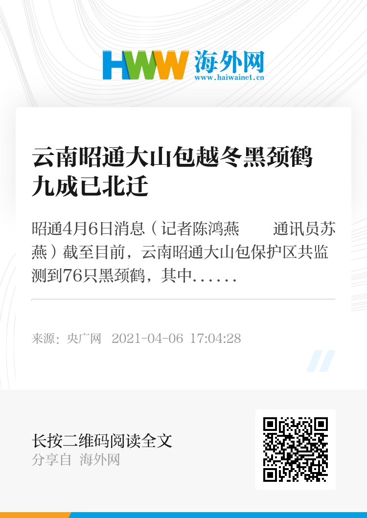 央广网昭通4月6日消息(记者陈鸿燕 通讯员苏燕)截至目前,云南昭通大山包保护区共监测到76只黑颈鹤,其中58只为体力虚弱的幼鹤或亚成鹤,这些黑颈鹤将继续在大山包休整一段时间、养精蓄锐后,再飞离大山包。这也表明在大山包越冬黑颈鹤中的九成以上已迁往若尔盖繁殖地。