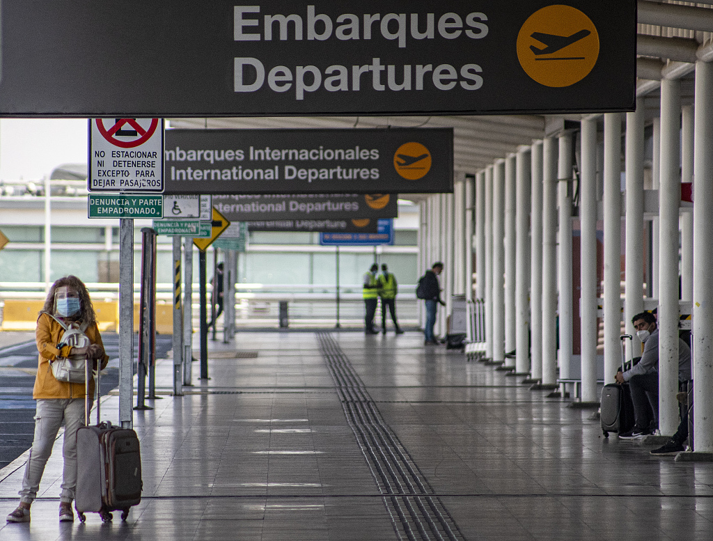 图为智利圣地亚哥机场内旅客佩戴口罩出行,机场内人迹罕至。图片来源:人民视觉