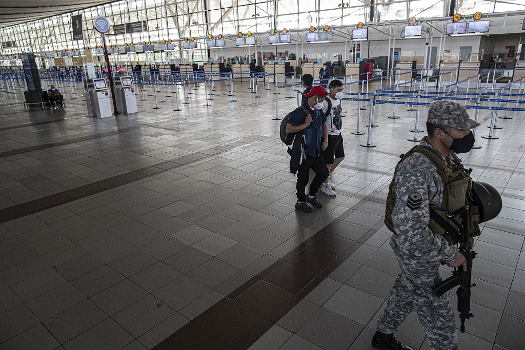 图为智利圣地亚哥机场内旅客佩戴口罩出行,机场内人迹罕至。图片来源:人民视觉