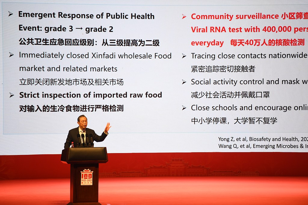 ​4月6日下午,中国工程院院士、呼吸内科学家钟南山在厦门大学开讲《新冠防控策略与疫苗研发》。当日,厦大百年校庆大会举行。图片来源:人民视觉